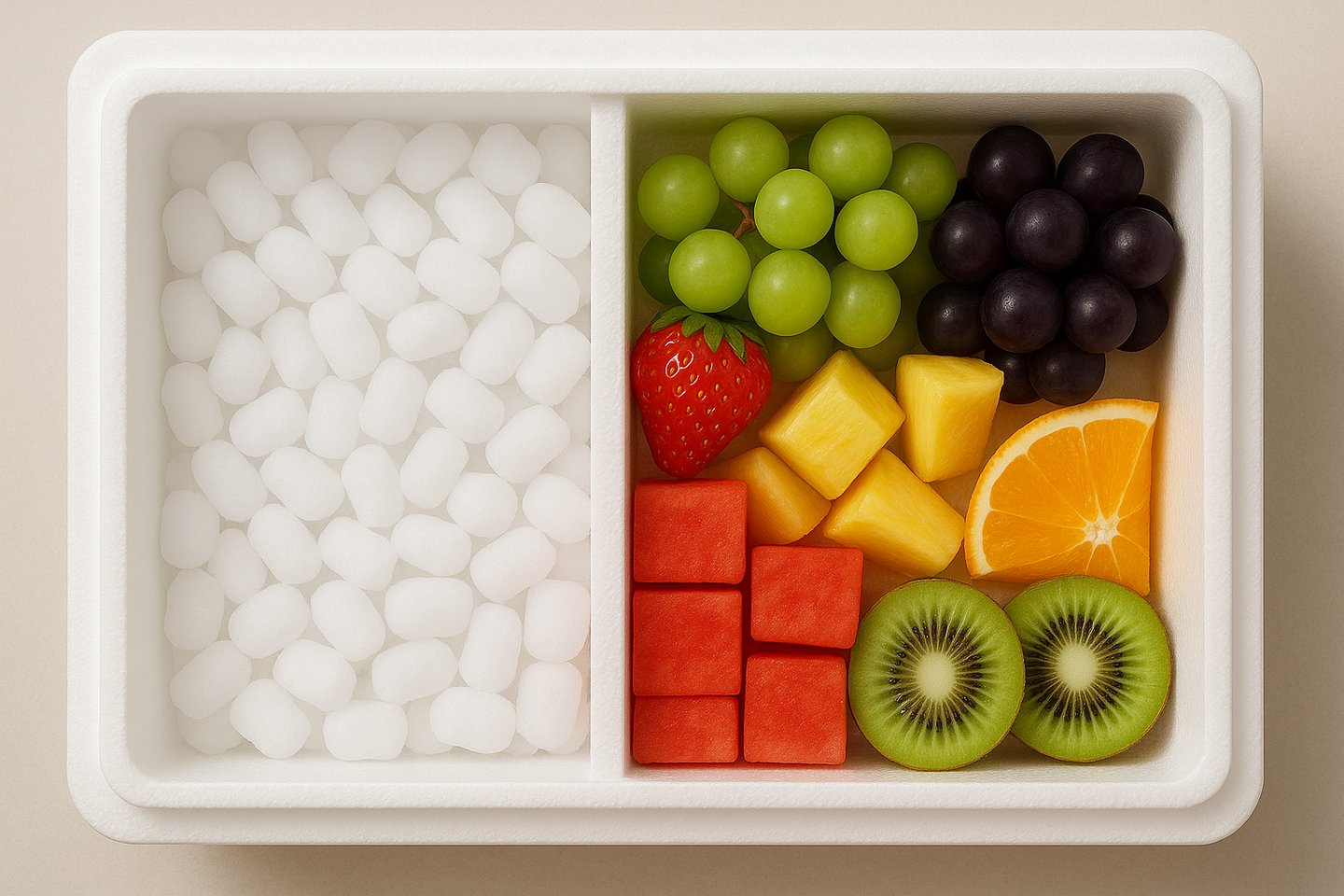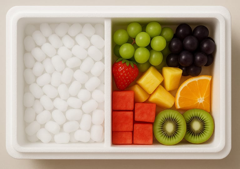 COLOQUE O GELO SECO EM UM DOS CANTOS DA CAIXA E CUBRA COM UM PANO OU SEPARE-O COM UMA PLACA DE ISOPOR (COMO NA IMAGEM). NO OUTRO CANTO, ACOMODE AS FRUTAS, GARANTINDO QUE NÃO HAJA CONTATO DIRETO COM O GELO. EM SEGUIDA, FECHE A CAIXA E ENVOLVA-A COM UM PLÁSTICO INSULFILM.