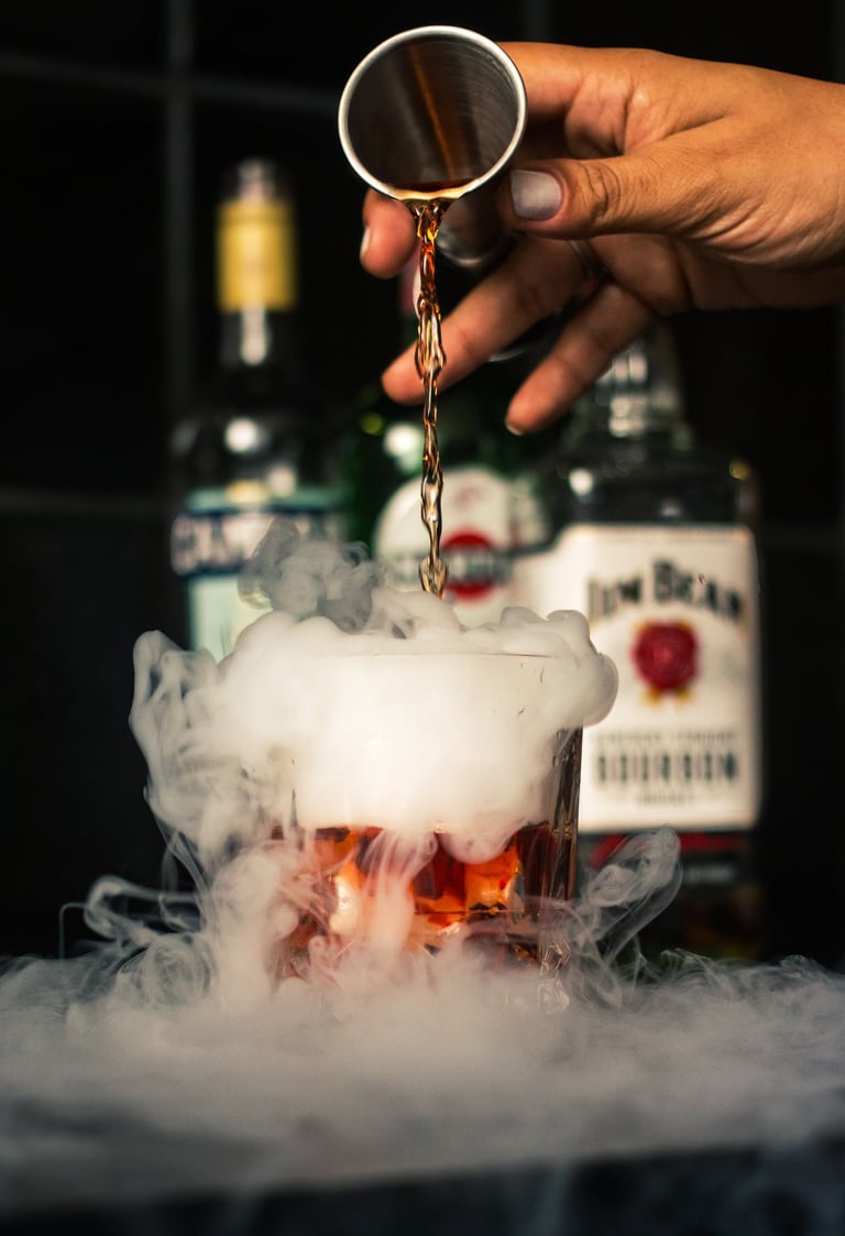 O CO₂ sólido se transforma rapidamente em gás ao entrar em contato com um líquido mais quente. Esse gás gelado resfria a umidade do ar ao redor, formando condensação em forma de névoa branca. O resultado é uma fumaça fria e densa que se espalha visualmente de forma impressionante sobre a bebida.